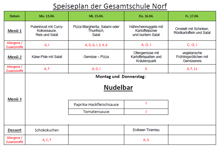Die Schülerinnen und Schüler haben Wert daraufgelegt, dass das Essen frisch, qualitativ hochwertig und gut schmeckt. Außerdem möchten unsere Schülerinnen und Schüler immer zwischen zwei Essen auswählen, davon soll ein Essen vegetarisch sein. Grundsätzlich wird es kein Schweinefleisch geben, so dass auch muslimische Schülerinnen und Schüler immer beide Gerichte auswählen können.
